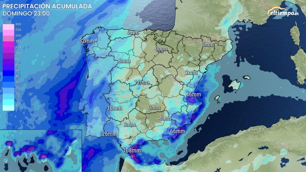 El domingo las fuertes lluvias estarán presentes en regiones del sureste y la costa mediterránea. Podrán esperarse desde primera hora de la mañana acompañadas por tormentas en regiones de la costa de Cádiz, Málaga, Almería, Murcia y el sur de Alicante.