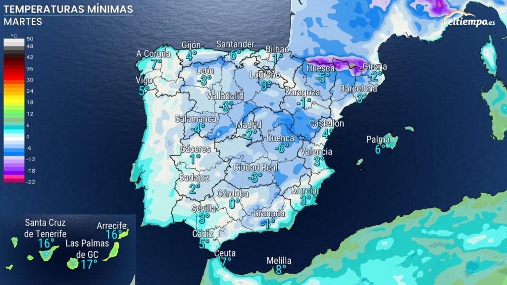 Tenemos avisos el martes, día de Reyes, por temperaturas mínimas de hasta -10 ºC en el Pirineo, donde está activado el nivel naranja. En la Sierra de Madrid pueden alcanzarse -7 ºC, en el sur del sistema Ibérico y sur de Aragón hasta -6 ºC, al igual que en el norte de Navarra.