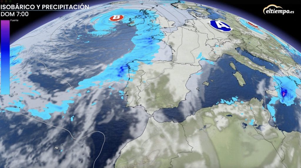 Pero esa situación cambia este fin de semana, sobre todo el domingo, con la entrada de un frente frío bastante activo que llega desde el Atlántico, asociado a una profunda borrasca cuyo centro pasará por las Islas Británicas.