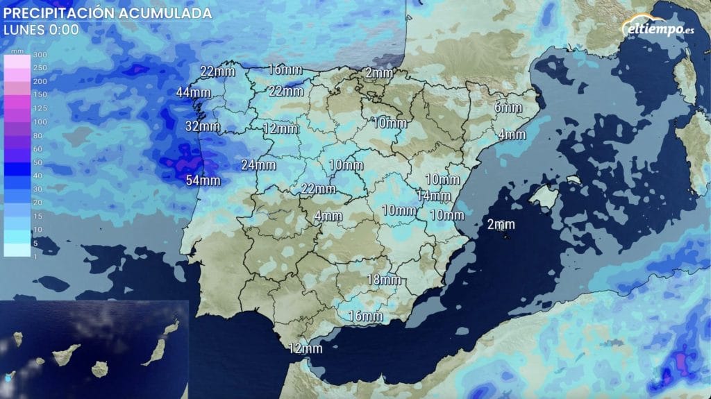 Precisamente, la comunidad gallega es la que más agua va a acumular, sobre todo en las costas occidentales, aunque la lluvia, de forma más aislada y con cantidades inferiores, también se extenderá por las comunidades cantábricas occidentales, la meseta norte e incluso el Sistema Central y zonas del centro de la península.