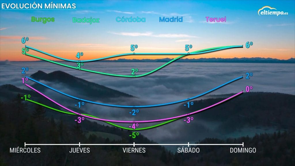 Las heladas ganarán extensión e intensidad, dejando mínimas en los -5ºC en amplias zonas. De cara al fin de semana, todo parece indicar que las temperaturas subirían en gran parte del país, aunque como se ha comentado, sobre todo afectará a las máximas.