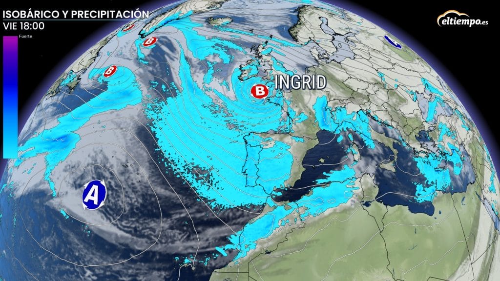 El tiempo en la Península y Baleares seguirá marcado por el paso de frentes asociados a la borrasca Ingrid con un temporal atlántico.