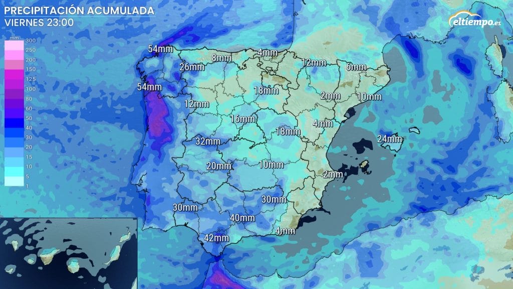 Los mayores acumulados se esperan en el oeste de Galicia, donde las precipitaciones podrían ir acompañadas de tormentas y granizo ocasional. Tampoco se descarta alguna tormenta puntual en Baleares.