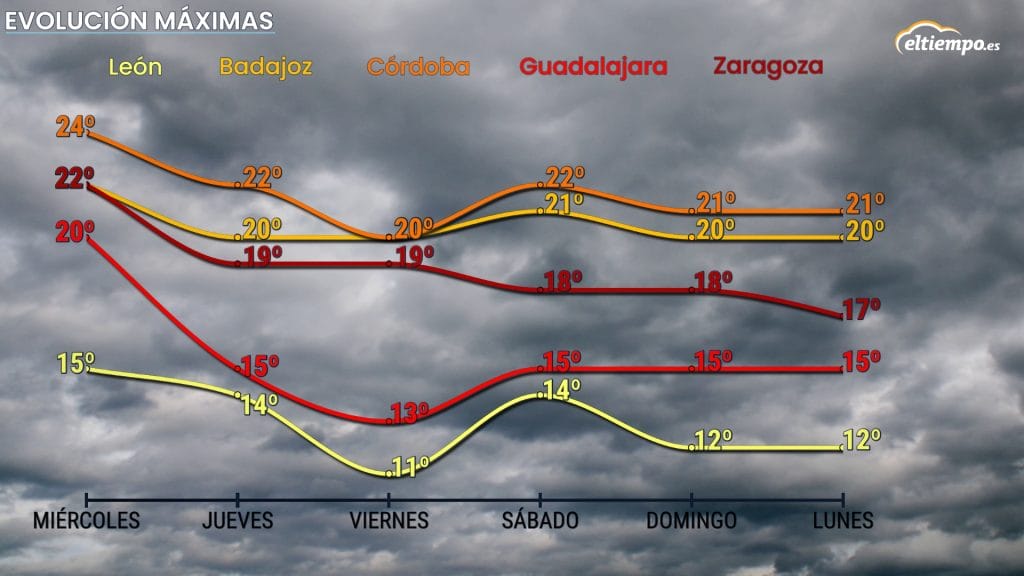 A partir de entonces y hasta que acabe la semana, las temperaturas se mantendrán con pocos cambios y continuarán frescas. Tan solo se espera que superen los 20ºC en zonas del sur de Extremadura, de Andalucía, Murcia, costas de la Comunidad Valenciana, sur de Cataluña, Baleares.