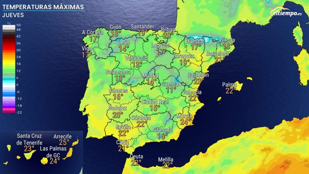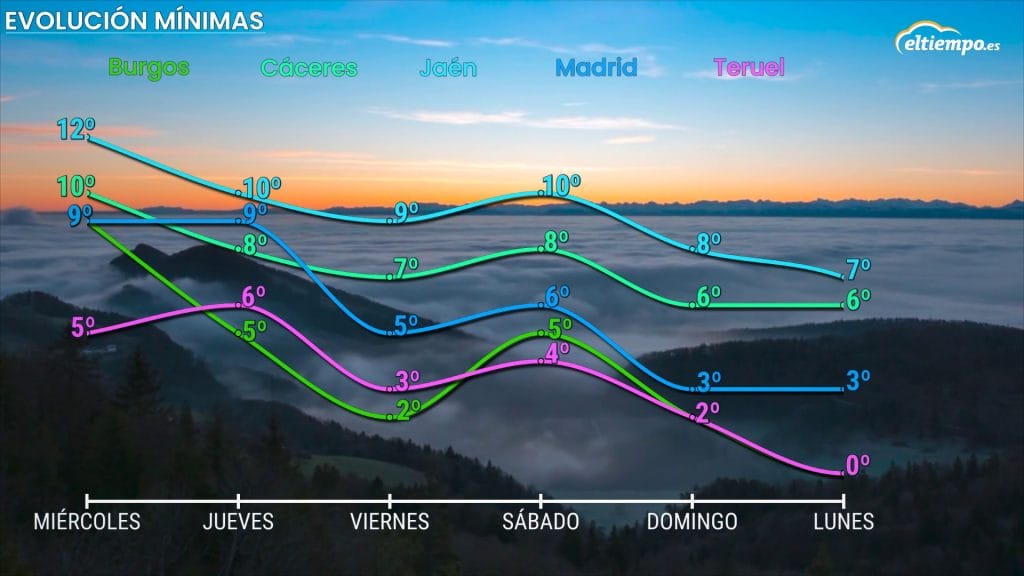También serán más altas en Canarias. En ciudades como Madrid, Jaén o Cáceres, la máxima quedaría sobre los 15ºC.