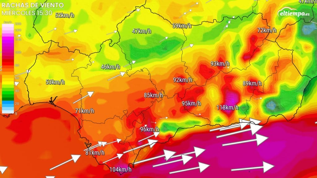 En Andalucía, las rachas alcanzarán los 70 km/h en todas las provincias, llegando incluso a 80 km/h en zonas de Granada y Almería. Los avisos naranjas persistirán en el litoral de Cádiz, el Estrecho y Ceuta, donde las rachas podrán llegar a los 100 km/h. También se esperan rachas por encima de esta cifra en Jaén y la Subbética cordobesa.