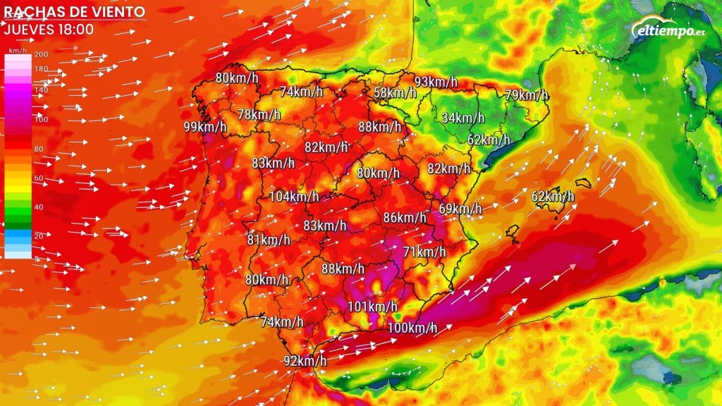 En regiones próximas a los principales sistemas montañosos como el sistema Central, la cordillera Cantábrica y el sistema Ibérico estas rachas de viento podrán alcanzar los 80 km/h. Las islas Baleares también podrán experimentar rachas de viento que superen los 80 km/h.