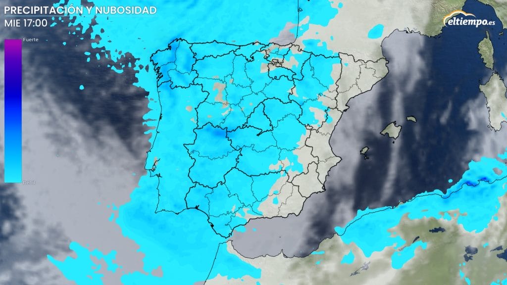 Durante la jornada las precipitaciones irán avanzando y podrán ser intensas durante la tarde-noche en puntos de Castilla-La Mancha, la costa cantábrica, Aragón y la mayor parte de Andalucía, especialmente en Cádiz. Estas precipitaciones acabarán llegando a lo largo de la noche del miércoles a zonas del este, como Lleida o la Comunidad Valenciana.