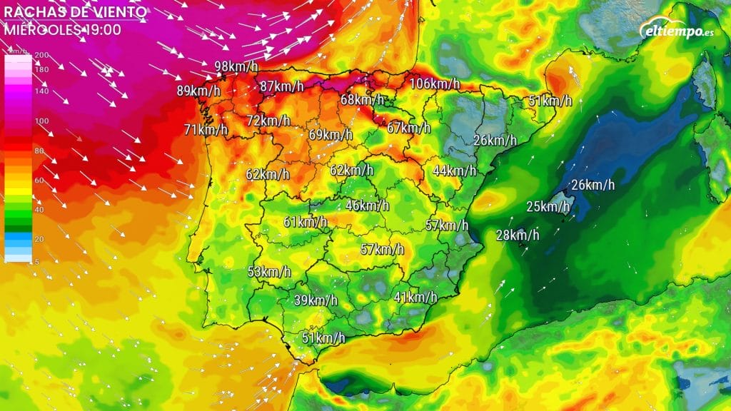 Se esperan también intensas rachas de viento durante la jornada que harán saltar los avisos tanto en zonas del norte como del este y sureste.