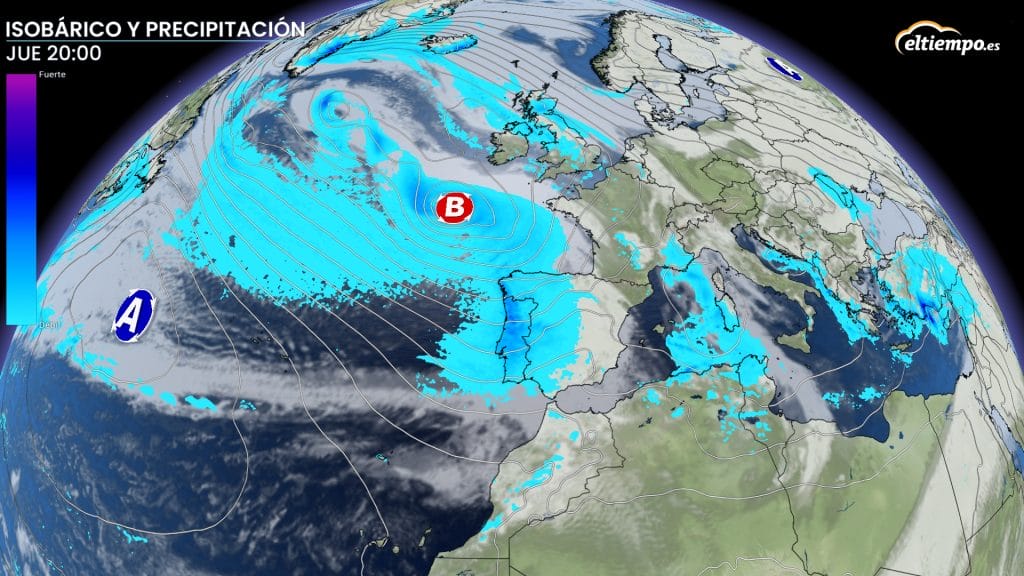 El jueves un nuevo frente entraría por el oeste, más activo que los previos. Las lluvias podrán ser localmente intensas en regiones de Galicia, Extremadura y Andalucía. Para la noche, las precipitaciones habrán abarcado la mayor parte de la Península Ibérica.