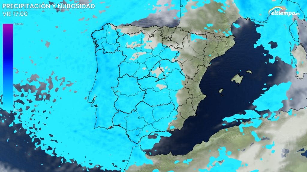 A lo largo de la madrugada y la mañana del viernes el frente continuaría avanzando hacia el este. Sin embargo este iría perdiendo intensidad aunque todavía dejando lluvias en amplias regiones. La nieve, a su vez, se vería inicialmente en cotas medias-altas, con un descenso gradual tras el paso del frente hasta cotas medias.
