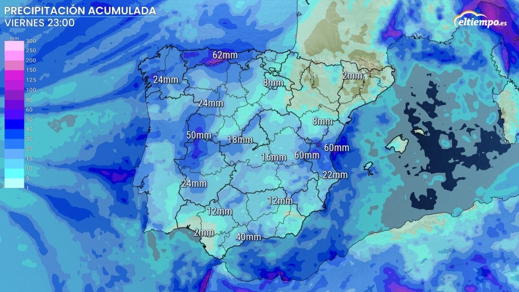 Durante la primera mitad de la semana, los mayores acumulados podrán esperarse en puntos del mediterráneo. En Valencia por ejemplo, hasta el viernes podrían alcanzarse los 60 mm acumulados. Por Asturias, también podrán superarse los 60 mm acumulados durante las próximas jornadas.