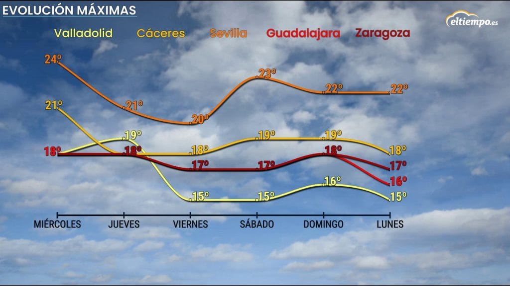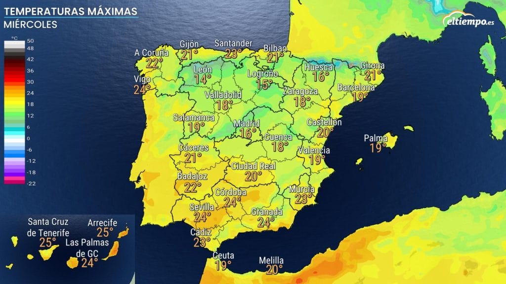 En las Castillas, muchas ciudades se acercarán a los 20ºC, mientras que en Andalucía se esperan máximas de hasta 24ºC en Sevilla, Córdoba y Granada, así como en Canarias, donde la mayoría de las islas superarán los 25ºC.