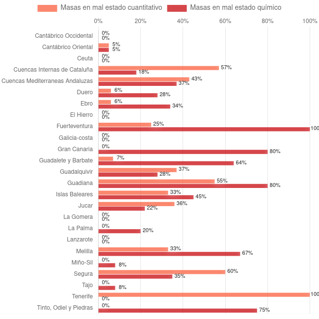 Así pues, destacan cuatro grandes zonas: Tenerife (100% de sus masas), cuenca del Segura (60%), cuencas internas de Cataluña (57%) y cuenca del Guadiana (55%). Otros casos relevantes son el Guadalquivir, las cuencas mediterráneas andaluzas o el Júcar.
