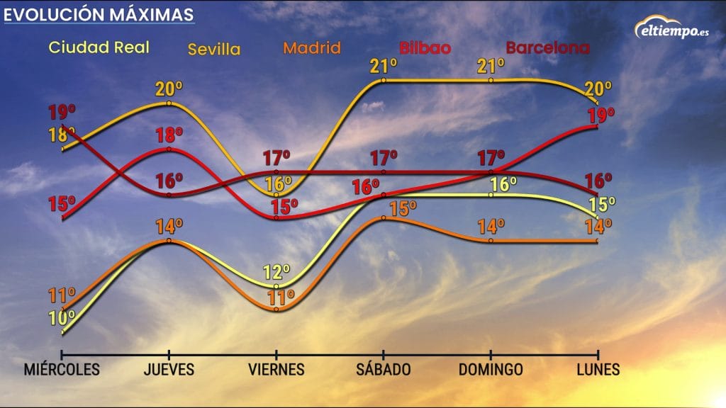 El viernes, con el paso del segundo frente, las temperaturas diurnas volverán a bajar en buena de España, especialmente en la mitad oeste. Será, pues, un día de temperaturas más frescas, pero en valores normales para esta época del año.