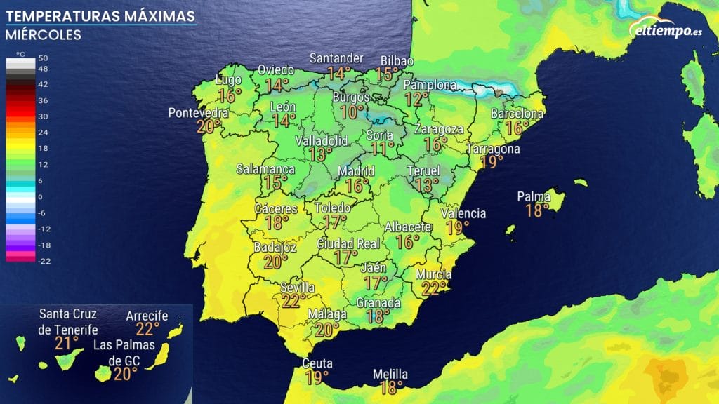 También podrían alcanzar los 20ºC en el sur de Galicia, Castilla-La Mancha y en puntos del litoral mediterráneo y Baleares. En Canarias serán más altas, superando los 20-23ºC. En el resto del país, en general las máximas superarán los 15ºC.