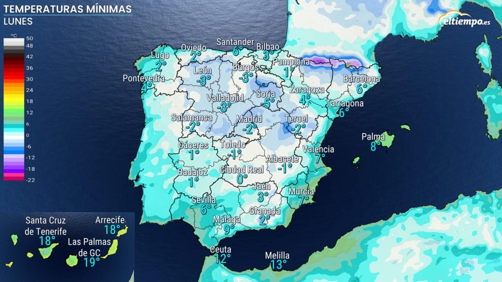 El arranque de la semana llega con una mañana muy fría en gran parte del territorio. En el interior peninsular se han registrado mínimas entre –3 ºC y –6 ºC, mientras que en numerosos puntos del norte y el centro los termómetros han vuelto a situarse por debajo de los 0 ºC.