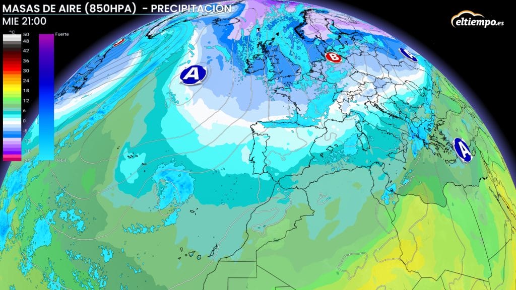 Ya durante este martes tendremos la afección de una masa de aire más fresco en amplias zonas de la mitad norte peninsular. El miércoles, no obstante, será cuando llegue un frente frío desde el norte, detrás del cual vendrá la masa de aire que desplomará las temperaturas: será entonces cuando llegue el frío a España.