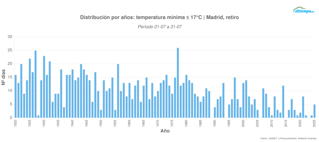 Algunos argumentarán que lo importante es la sensación. Bien: ha habido noches frías para la época, con percentiles de mínimas inferiores al 30 e incluso al 10. No obstante, son datos puntuales. La realidad es que la media es cálida. Es más: las noches con mínimas inferiores a 17 ºC en Madrid son cada vez menos habituales en julio. Hace 40-60 años lo normal era unas 12-15 en cada julio. Ahora, apenas llega a 4-6.