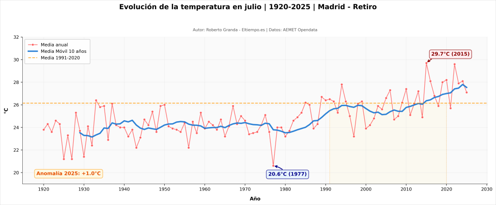 Como se ve en la gráfica inferior, el 2025 ha sido un año «fresco» comparado con los más recientes, pero ni de lejos ha sido un julio frío. Ni de noche ni de día.