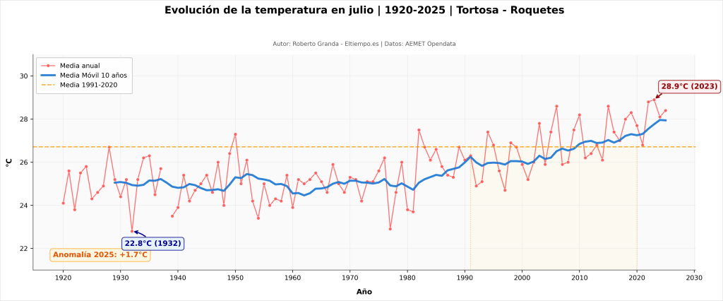 Otros argumentarán que la isla de calor, el efecto de la ciudad, desvirtúa las medidas. Que el entorno de El Retiro, además, ha cambiado. De acuerdo, vamos a ver entonces los datos de una zona rural, con registros desde 1920, fuera de núcleo urbano y sin cambios: Tortosa. La tendencia es la misma.