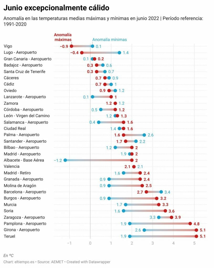 Después del mayo más cálido en 50 años, junio no quería quedarse atrás. Así pues, tras la excepcional ola de calor que tuvo lugar entre el 11 y el 18 del mes, las anomalías han terminado siendo positivas. Y muy acusadas en amplias zonas. En términos generales, el mes fue entre muy cálido y extremadamente cálido.