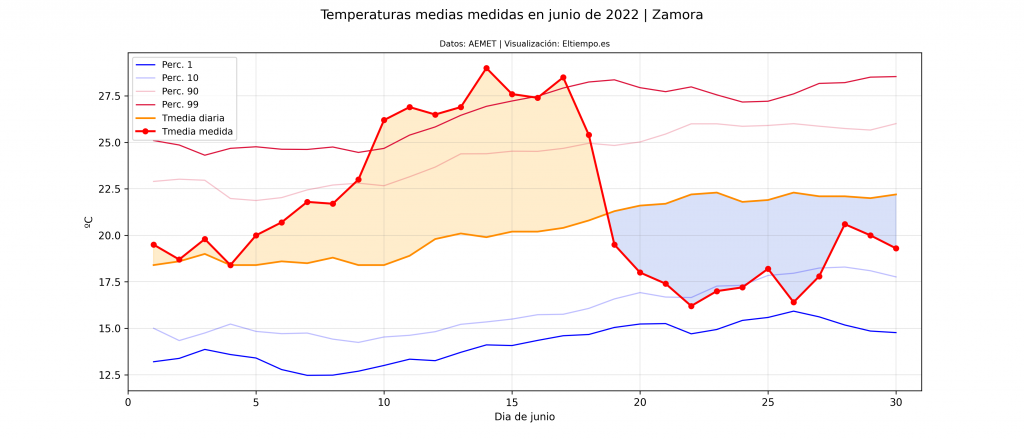 Se aprecia muy bien en la primera figura, que representa la evolución de las temperaturas medias en Zamora. En la mitad oeste fue donde más se notó este descenso, ya que en otros lugares como Pamplona, las temperaturas se mantuvieron muy elevadas hasta varios días después.