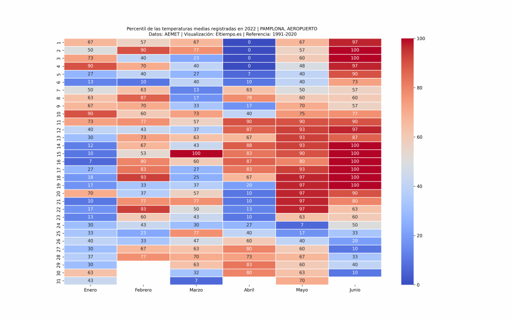 La siguiente figura representa el percentil de la temperatura media diaria para cada día de este 2022 en la estación de Pamplona - Aeropuerto. Recordemos que el percentil nos sirve para conocer cómo de anómalo (cálido o frío) es un valor.