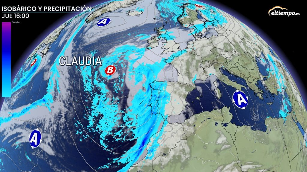 La borrasca Claudia se sitúa ya al oeste de la península y allí va a a continuar casi estática. Hasta el fin de semana nos irá enviando frentes, con lluvias y viento, que primero llegarán a Canarias y a partir del jueves también a la península.
