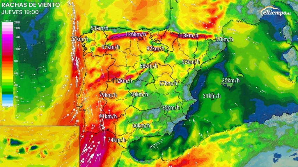Al sur de Galicia, oeste de Castilla y León, norte de Cáceres, Huelva y Cádiz pueden ser intensas y dejar acumulados importantes. El viento del sur dejará rachas de 80-100 km/h en gran parte del norte y oeste peninsular, sobre todo en zonas de montaña y habrá olas de 4 metros en las costas de Galicia.