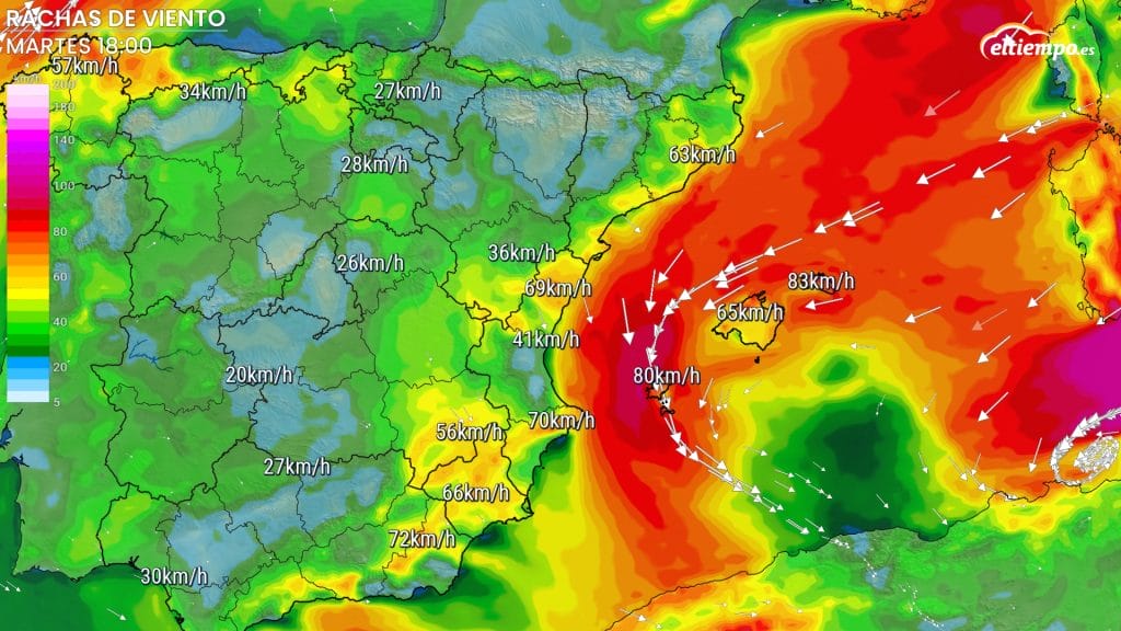 A lo largo del martes las fuertes lluvias seguirán en Cataluña durante la mayor parte del día. Sin embargo, estas afectarán a más regiones como la Comunidad Valenciana o Aragón. Se tendrán avisos por fuertes lluvias en Teruel, el litoral norte de Castellón, el litoral sur de Valencia, el litoral norte de Alicante, Mallorca, Ibiza y Formentera.