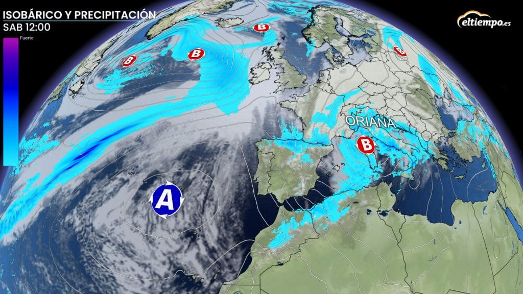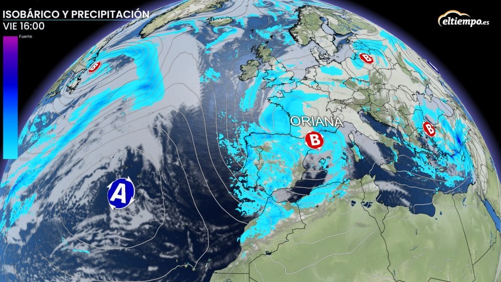 El anticiclón recuperará su posición al oeste de la Península mientras la borrasca Oriana se situará al este, favoreciendo la entrada de aire ártico por el norte de España. Esto provocará un descenso generalizado de las temperaturas, que el viernes bajarán entre 2 y 3 ºC, superando los 5 ºC en el noreste y alrededor de 4 ºC en el sureste.