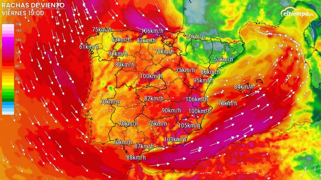 Las rachas serán superiores a los 70 km/h, incluso superando los 80 km/h en el este del país y regiones próximas a los sistemas montañosos. Los avisos serán naranjas en Albacete, Almería, Murcia, Tarragona, Melilla y el interior de la comunidad Valenciana, localidades donde el viento podrá superar los 100 km/h.