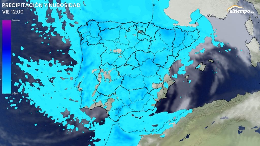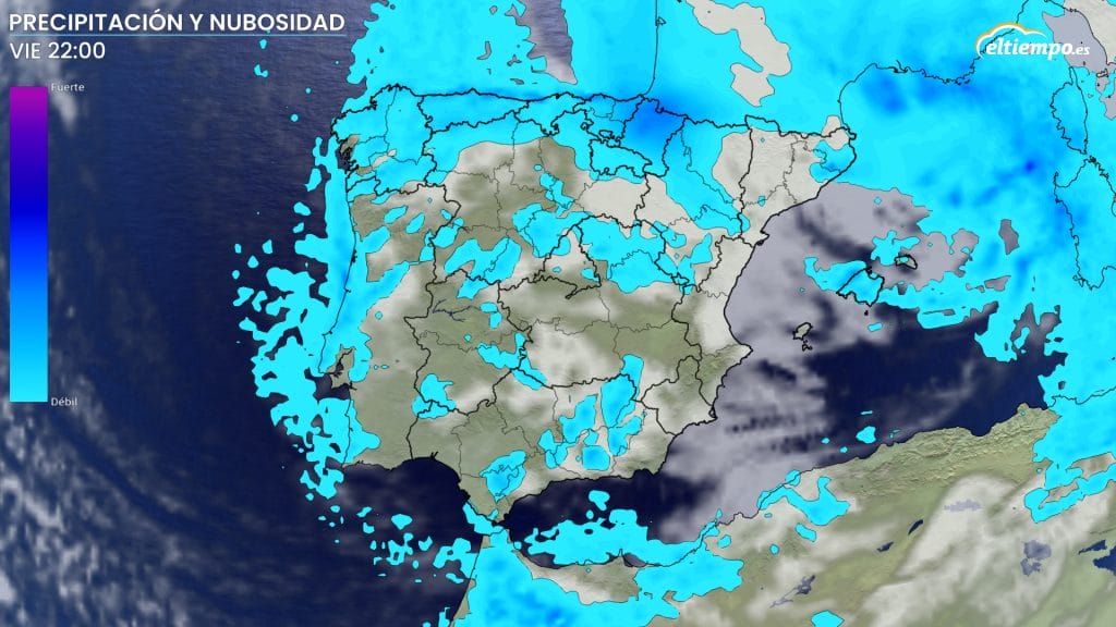 Con el paso de las horas, las fuertes lluvias continuarán barriendo la península, afectando también a zonas de Andalucía, Castilla-La Mancha, Aragón y Cataluña. Eventualmente, los chubascos terminarán por afectar también buena parte de la costa Mediterránea y las islas Baleares, donde podrán ser intensas.