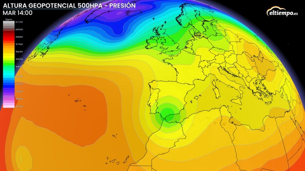 La DANA continuará descendiendo con el paso de las horas, situándose sobre regiones del sur. Esto favorecerá un acusado descenso en la mitad sur, especialmente en el sureste peninsular, donde los termómetros podrán perder más de 6 ºC en las proximidades del sistema Bético.