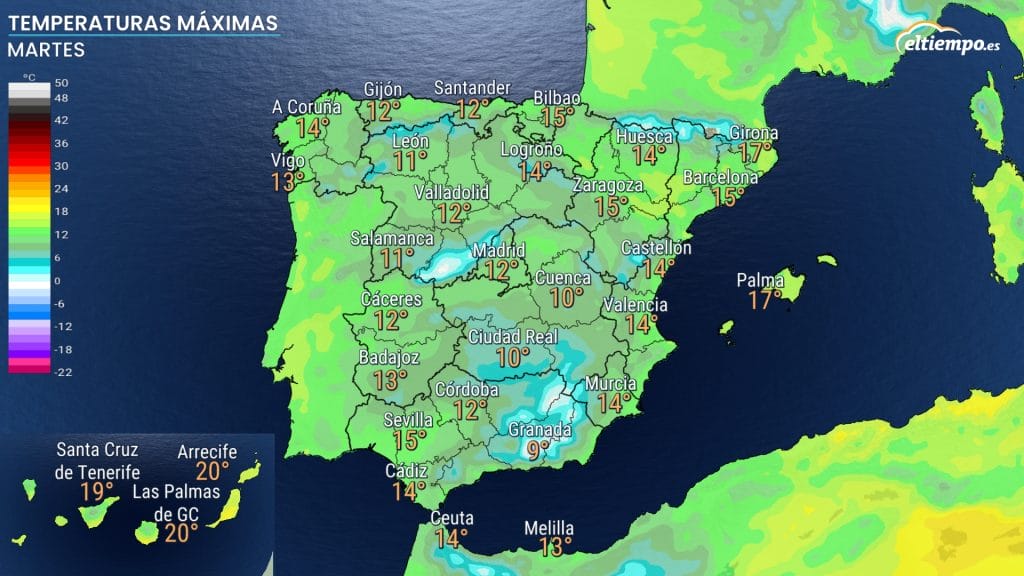 En las costas de Andalucía, Murcia y la Comunidad Valenciana los termómetros estarán por debajo de los 15 ºC. En las islas Canarias las máximas se mantendrán en su mayoría, alcanzando (e incluso superando) los 18 ºC en la mayor parte del archipiélago.