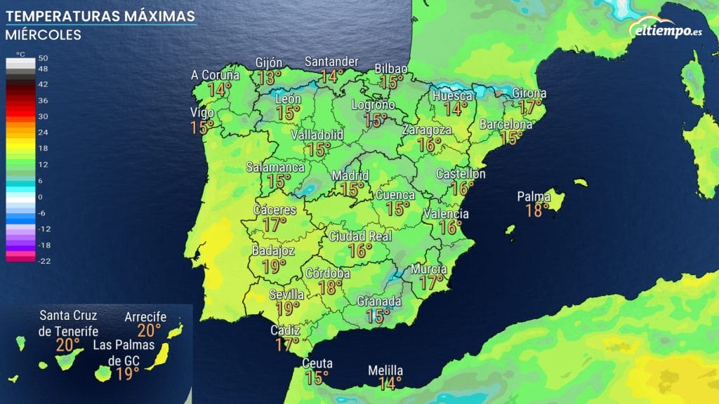 Las temperaturas máximas más altas se darán en zonas de las islas Baleares, Huelva y Ourense, donde podrán alcanzarse los 18 ºC. En Badajoz y Sevilla incluso los termómetros podrán llegar a los 19 ºC durante la jornada.