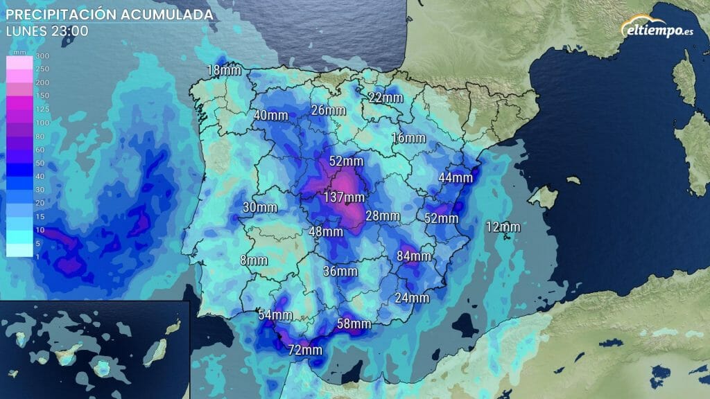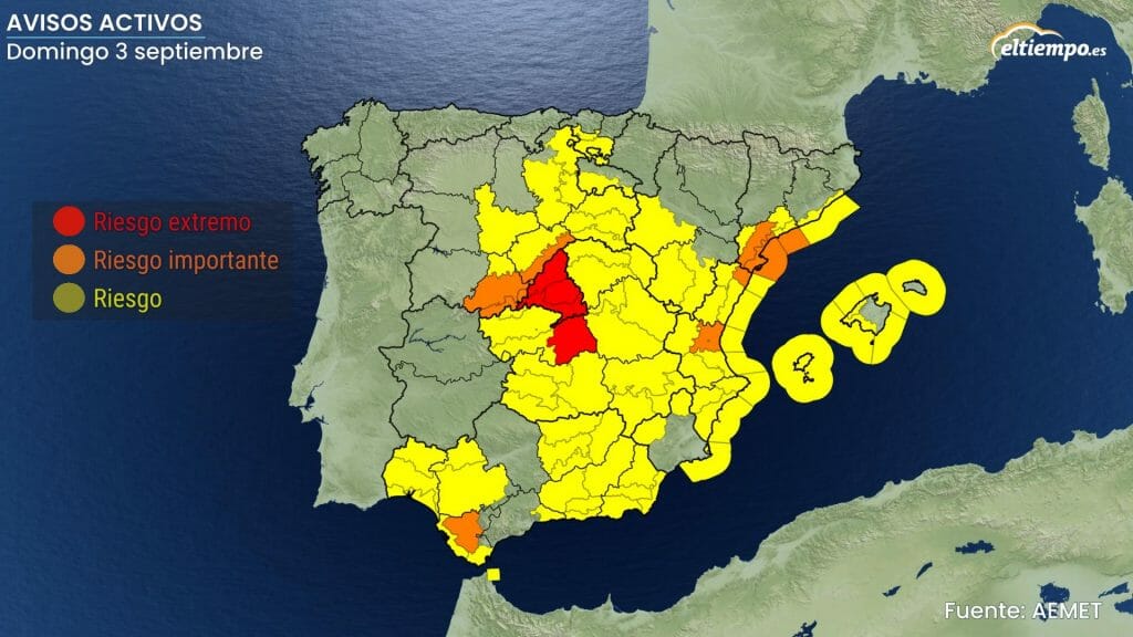 Durante la tarde de este domingo y madrugada de domingo a lunes, las lluvias serán intensas y persistentes en el centro peninsular. Por ello se han activado ya avisos de nivel rojo en la Comunidad de Madrid y la provincia de Toledo por acumulados que pueden superar los 120 mm en 24 horas y localmente los 120mm en 12 horas. Unas lluvias con un carácter torrencial y que pueden dar lugar a inundaciones.