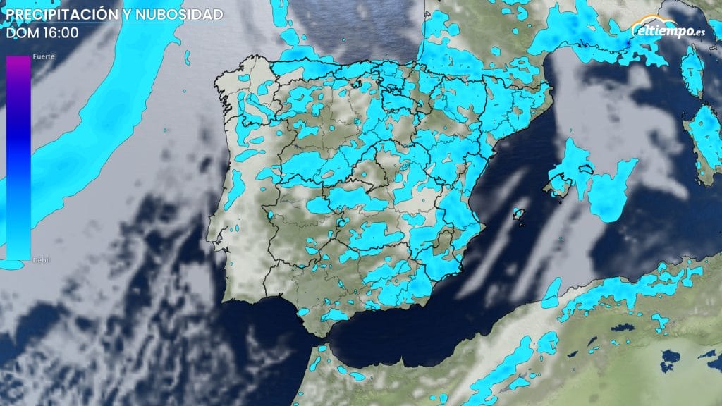 De cara al domingo, aunque las lluvias continuarán acompañando a buena parte de España, seguirán perdiendo intensidad, hasta desaparecer eventualmente durante la tarde en la mayor parte del país.