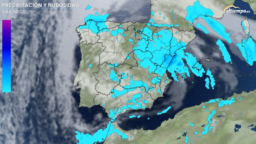 El sábado la lluvia seguirá muy presente en la mayor parte del país; sin embargo, estas serán algo menos intensas que las del viernes, aunque todavía se esperan fuertes acumulados en puntos de la costa este peninsular, además de Baleares.