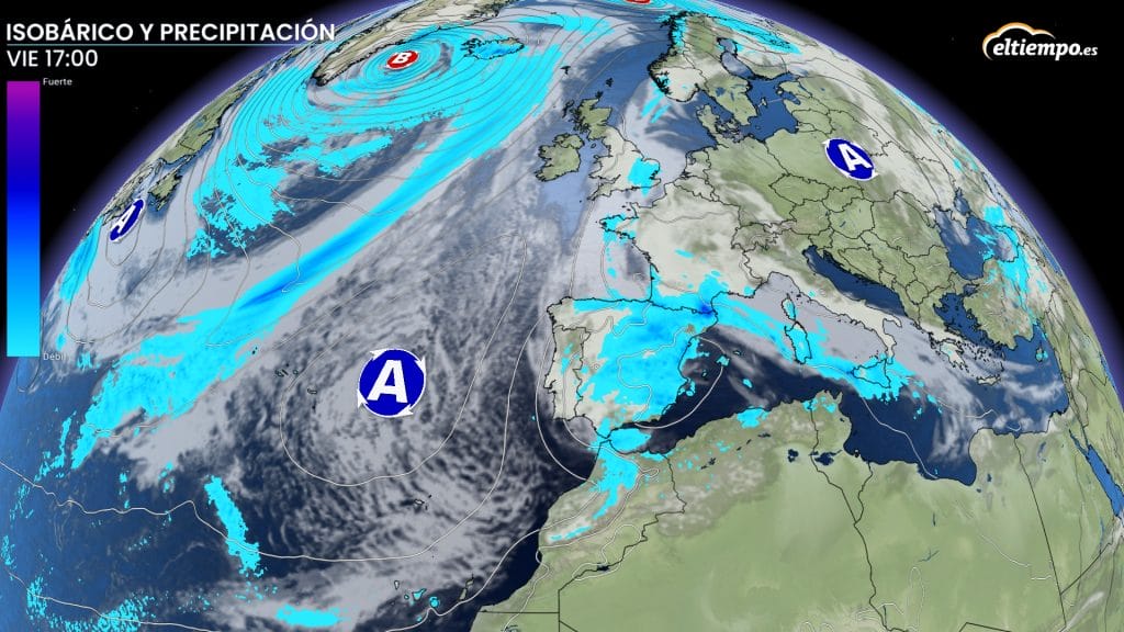 El viernes la inestabilidad dominará por completo España, dejando lluvias fuertes casi generalizadas en todo el país. Se espera que estas sean especialmente intensas en localidades del norte como Asturias o Cantabria, y del este como la Comunidad Valenciana, el valle del Ebro, y sobre todo, Cataluña. En esta última región se esperan los mayores acumulados de la jornada.