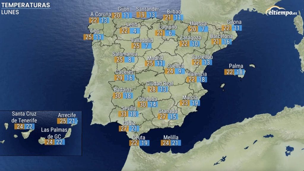 El lunes vamos a seguir viendo temperaturas máximas por encima de los 30ºC en zonas del sur, mientras que por el norte y algunas zonas del este se quedarán entre los 20ºC y los 25ºC.