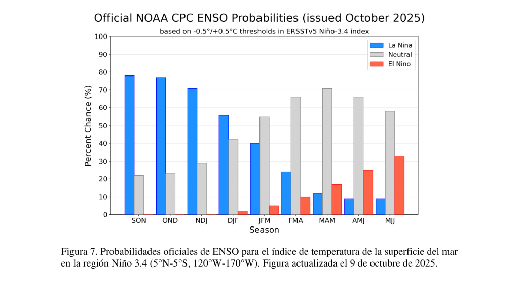 Según las últimas proyecciones de la NOAA (Administración Nacional Oceánica y Atmosférica), este evento de La Niña se irá desarrollando durante los próximos meses y se prolongará hasta principios de 2026.