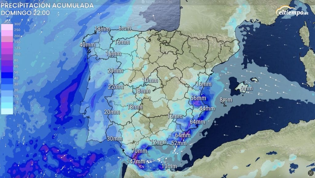 Entre el sábado y el domingo, las precipitaciones se extenderán a otras zonas del litoral Mediterráneo desde el este de Andalucía, pasando por Murcia y la Comunidad Valenciana, hasta Cataluña y Baleares. En estas dos últimas comunidades las precipitaciones deberían ser más aisladas.