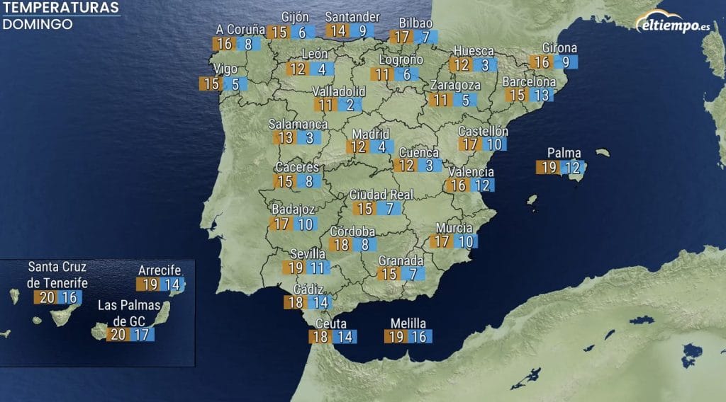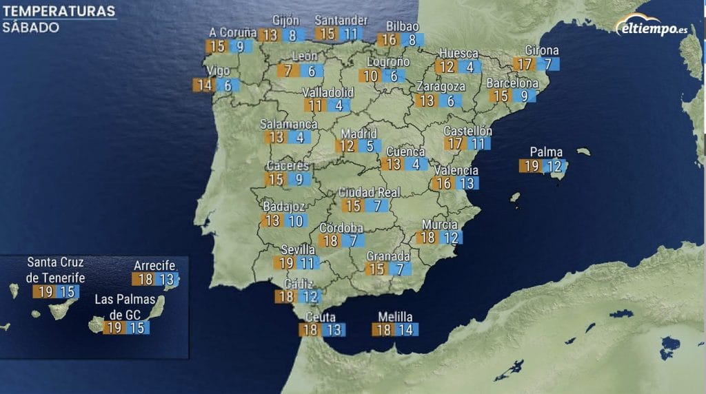 El sábado las temperaturas más altas las van a registrar las capitales del sur peninsular, pero también las de Canarias, donde el mercurio se acercará a los 20ºC. En Canarias, pese a ser suaves, no serán tan elevadas como hace unos días.