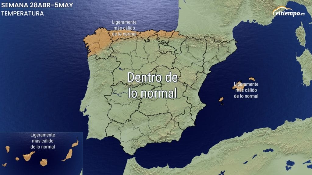 Después de semana santa se espera que domine la normalidad en nuestro país, con ligeras anomalías cálidas en el extremo norte y ambos archipiélagos entre los días 28 de abril y 5 de mayo así como anomalías negativas de precipitación en Canarias.