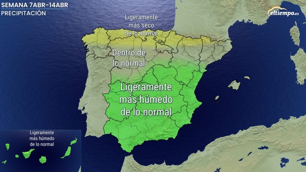 Las tendencias de lluvia muestran que al menos hasta mediados de este mes de abril, se esperan precipitaciones ligeramente por encima de lo normal en el la mayor parte de la Península (salvo el extremo norte donde podrían estar por debajo), así como en Canarias.
