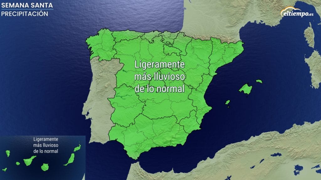 ¿Vamos a tener lluvia en Semana Santa entonces? En cuanto a la precipitación, el modelo europeo prevé una Semana Santa ligeramente más lluviosa de lo normal en todo el país. También se detecta esta anomalía húmeda en ambos archipiélagos.