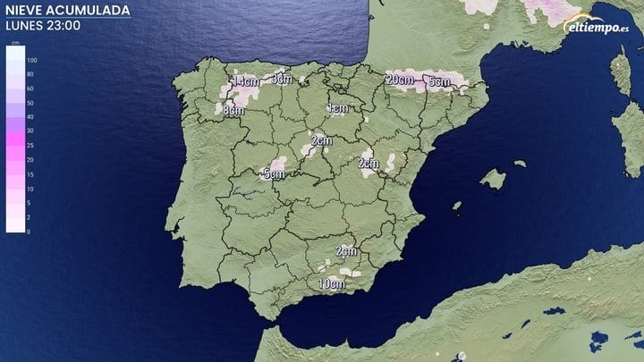 Las nevadas, aunque no serán de gran envergadura, marcarán la llegada de los primeros copos del año 2025, con una cota de nieve que descenderá hasta los 1.200 metros en las montañas del sistema central. Se prevén acumulados que podrían alcanzar los 2 centímetros.