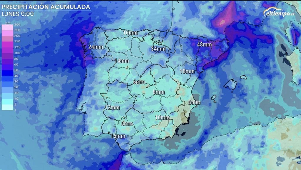 Entre las zonas donde más acumulación de precipitación vamos a ver está el oeste de Galicia, Cataluña, Baleares, la zona del Estrecho y Canarias.